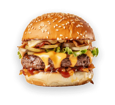 Cutlet BurgerBread, 120g Meet, Cheese, BBQ Sauce, Bacon, Lettuce, Pinkles and Red Onion.