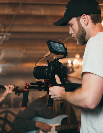 Man holding camera and woman playing violin