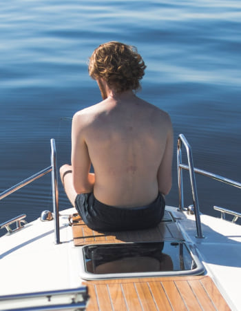 Man in black shorts on boat end